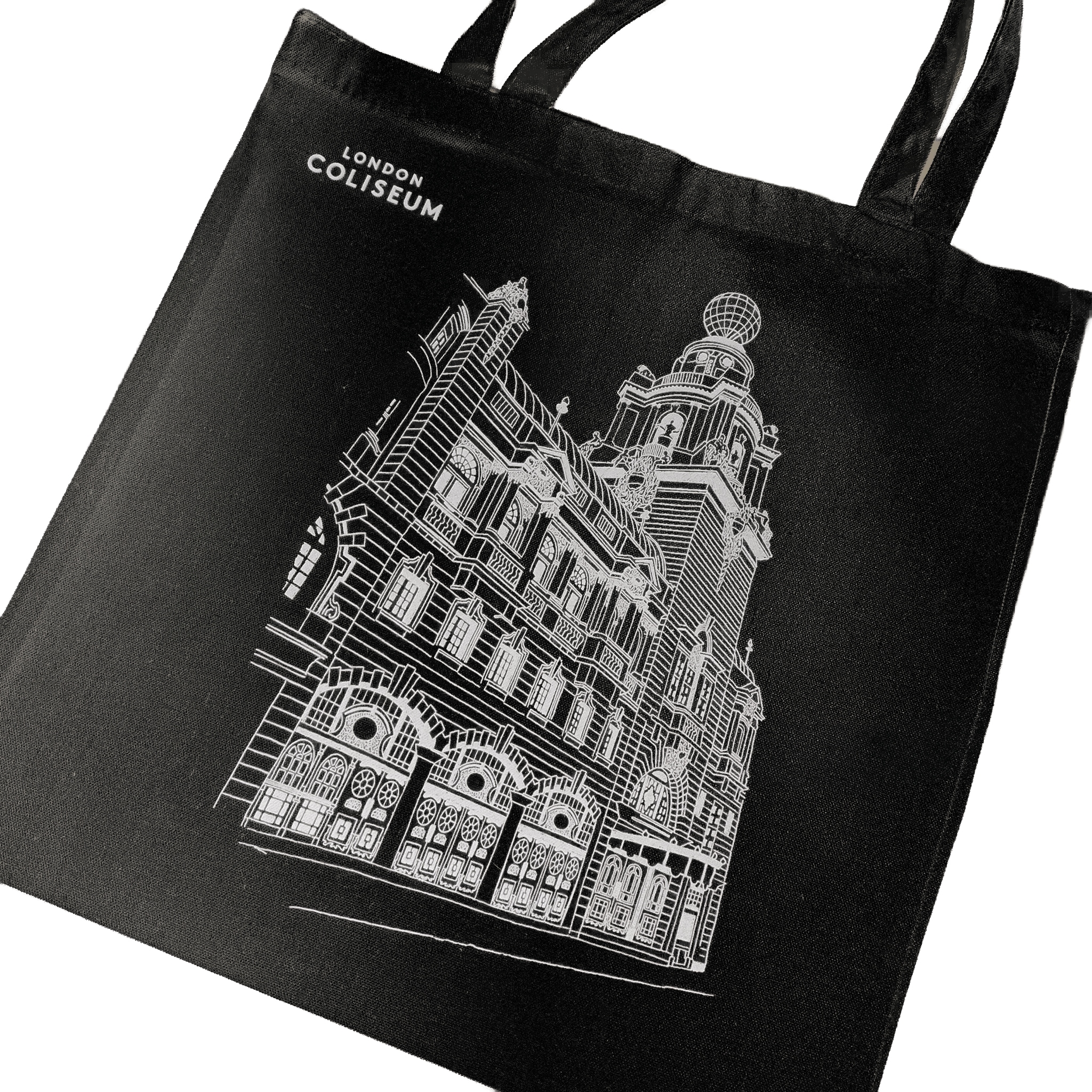 A high quality 100% cotton black tote bag featuring a hand drawn sketch of the Coliseum building printed in white.